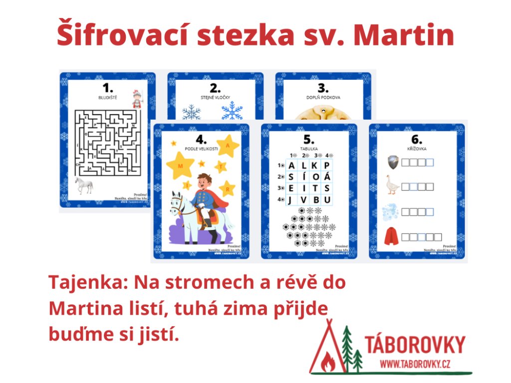 Šifrovací stezka s tématikou svatý Martin se hodí pro úplné šifrovací začátečníky, neobsahuje šifry, které není třeba dopředu s dětmi trénovat vhodné pro děti od 2. třídy víš.