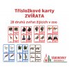 Zvířata žijící v zoo: (28 karet textu + obrázek, 28 karet obrázek) - slon, žirafa, opice, lachtan, lev, tygr, nosorožec, zebra, hroch, lenochod, velbloud, panda, mravenečník, surikata, pštros, plameňák, pelikán, papoušek, sup, tučňák, páv, želva, krokodýl, chameleon, hroznýš, kobra, žralok, rejnok.